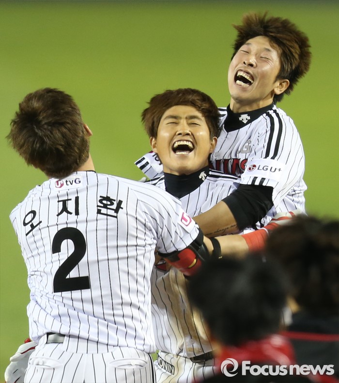 (서울=포커스뉴스) 29일 서울 잠실구장에서 열린 2016 프로야구 kt-LG 경기 9회말 1사 만루에서 LG 채은성이 끝내기 우전안타를 치고 오지환, 황목치승과 함꼐 환호하고 있다.
