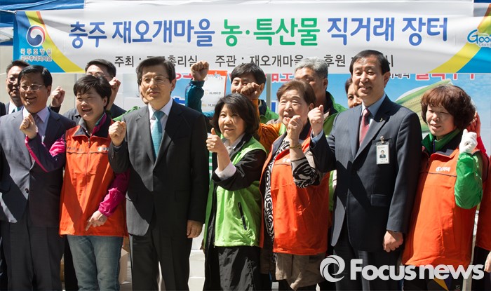 (세종=포커스뉴스) 황교안 국무총리가 26일 오전 세종시 정부세종청사 국토교통부 내 광장에서 열린 국무총리실과 1사 1촌 자매결연을 맺은 충주 재오개마을 농·특산물 직거래 장터에 방문해 주민들과 파이팅을하며 기념촬영을 하고 있다.