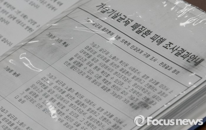 (서울=포커스뉴스) 28일 오전 서울 여의도 국회에서 심상정 정의당 상임대표 주재로 열린 가습기 살균제 3, 4등급 피해자 의료기록 분석 결과 및 피해 진상규명을 위한 간담회에 폐질환 피해 조사결과 안내문이 보이고 있다.