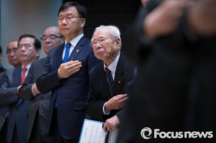 (서울=포커스뉴스) 29일 오전 서울 서초구 매헌기념관에서 열린 윤봉길 의사 의거 84주년 기념식에서 참석자들이 국민의례를 하고 있다.