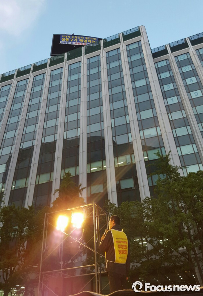(서울=포커스뉴스) 기아차 비정규직 노동자 최정명‧한규협씨의 고공농성이 324일째에 접어든 가운데 금속노조가 결의대회를 열고 기아차 비정규직 노동자의 전원 정규직화를 촉구했다.