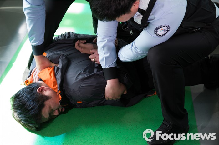 (서울=포커스뉴스) 28일 오후 서울 성동구 성수역 대합실에서 서울메트로 소속 지하철보안관들이 술에 취한 난동자를 제압하는 시범을 보이고 있다.