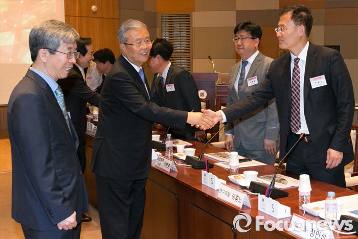 (광주=포커스뉴스) 김종인(가운데) 더불어민주당 비대위 대표가 25일 오후 광주과학기술원(GIST, 지스트)을 방문해 업무보고를 듣기에 앞서 참석자들과 인사하고 있다. 왼쪽은 문승현 총장.