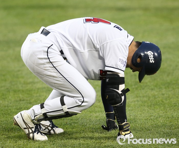 (서울=포커스뉴스) 26일 서울 잠실구장에서 열린 2016 프로야구 SK-두산 경기 2회말 1사 1루에서 두산 오재원이 SK 투수 켈리의 투구에 오른쪽 발을 맞고 그라운드에 엎드려 있다.