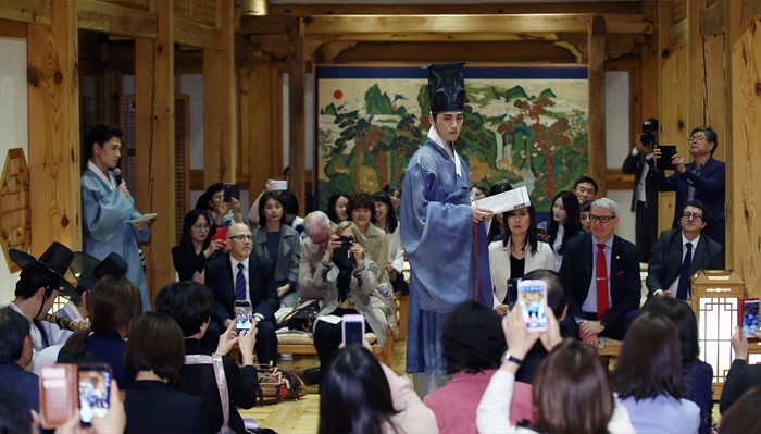 (서울=포커스뉴스) 문화체육관광부 해외문화홍보원(원장 김갑수)이 주한 외국인을 대상으로 한국문화를 소개하는 문화공감 콘서트 '헬로, 미스터 케이!(Hello, Mr. K!)’가 27일 성북구가구박물관에서 열렸다. 이날 콘서트에 참석한 주한 외국대사 및 직원, 외신 기자들이 조선시대 선비 생활상을 조명한 한복 패션쇼를 보고 있다. <사진제공=문화체육관광부>