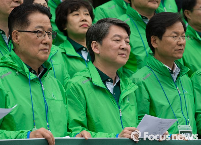 (양평=포커스뉴스) 안철수 국민의당 상임공동대표를 비롯한 20대 총선 당선자들이27일 오전 경기도 양평 한화리조트에서 열린 20대 총선 당선자 워크숍에서 선언문을 낭독하고 있다. 왼쪽부터 박지원 원내대표, 안 대표, 천정배 대표.