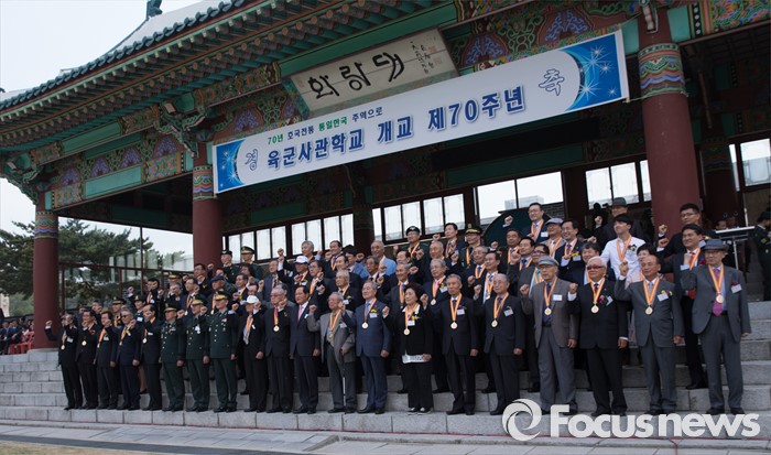 (서울=포커스뉴스) 29일 오후 서울 노원구 육군사관학교에서 열린 개교 70주년 기념식에서 최병로 육군사관학교장을 비롯한 아름다운 육사인 70인이 기념촬영 하고 있다.