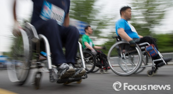 (서울=포커스뉴스) 30일 오전 서울 송파구 잠실종합운동장 인근에서 열린 '제24회 서울국제휠체어마라톤대회'에서 참가자들이 힘차게 출발하고 있다.