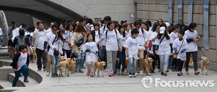 (서울=포커스뉴스) 27일 오전 서울 청계천에서 삼성화재안내견학교 훈련사들과 안내견들이 시민들과 함께 '안내견과의 만남' 행사를 하고 있다.