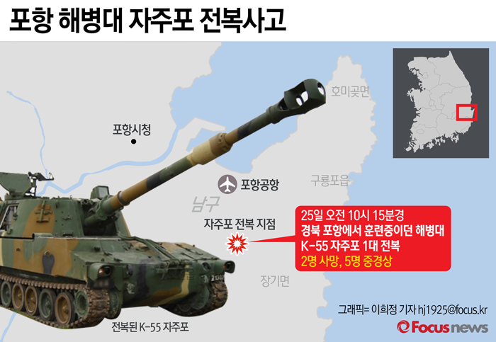 (서울=포커스뉴스) 25일 오전 경북 포항에서 훈련중이던 해병대 소속 자주포 1대가 낭떠러지로 떨어져 장병 2명이 사망하고 5명이 부상을 입었다.