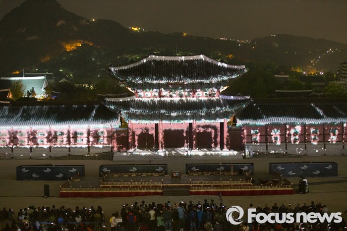(서울=포커스뉴스) 29일 저녁 서울 경복궁 흥례문 광장에서 열린 제 2회 궁중문화축전 개막제에서 경복궁의 역사를 빛으로 담아낸 '미디어 파사드' 공연이 시선을 사로잡고 있다. '오늘, 궁을 만나다'를 주제로 열리는 2016년 궁중문화축전은 다채로운 프로그램들과 함께 5월 8일까지 열린다.