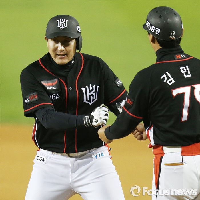 (서울=포커스뉴스) 29일 서울 잠실구장에서 열린 2016 프로야구 kt-LG 경기 8회초 2사 1,2루에서 kt 유한준이 동점 좌전안타를 치고 1루에서 김민재 코치의 축하를 받고 있다.