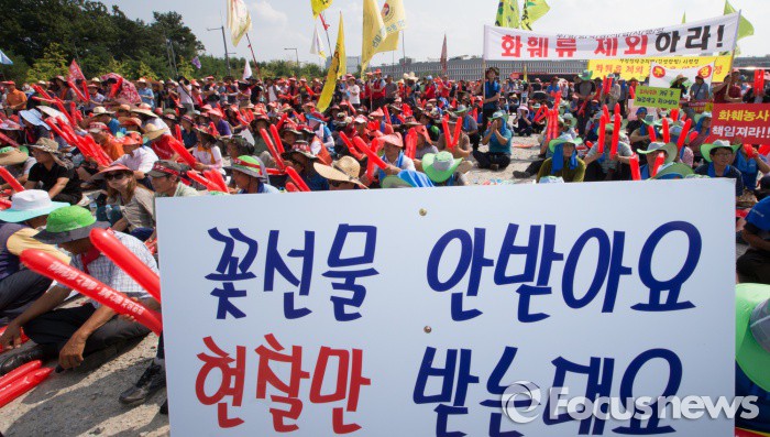 이어 "내수 경기 회복과 소상공인 보호를 위해서라도 김영란법은 시행 연기 혹은 예외 항목 확대가 이뤄지길 희망한다"고 주문했다.(세종=포커스뉴스) 지난해 9월 세종시 정부세종청사 제3주차장에서 한국농축산연합회 소속 회원들이 전국농민대회를 열고 김영란법을 규탄하고 있다.2015.09.04 김기태 기자