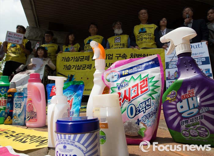 (서울=포커스뉴스) 2일 오후 서울 서초구 서울중앙지방검찰청 앞에서 가습기살균제 피해자와 가족모임과 환경보건시민센터 관계자들이 옥시레킷벤키저 대표 등 8명의 이사진 형사고발 기자회견을 하고 있다.