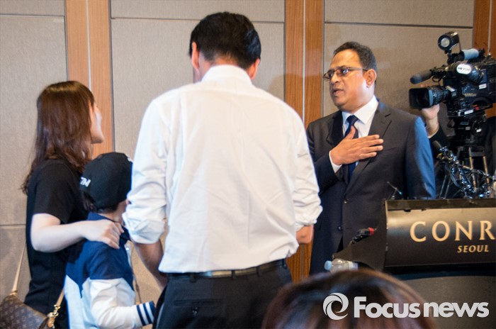 (서울=포커스뉴스) 2일 오전 서울 영등포구 콘래드호텔에서 열린 '옥시레킷벤키저(현 RB코리아) 가습기 살균제 파동' 관련 기자회견에서 아타 울라시드 사프달 옥시코리아 대표가 피해자 가족들에게 항의 받고 있다.