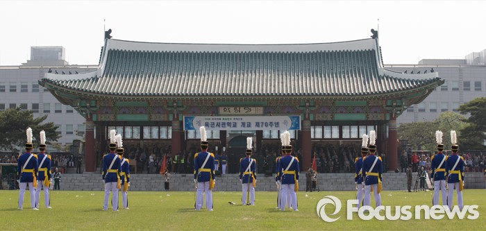 (서울=포커스뉴스) 29일 오후 서울 노원구 육군사관학교에서 열린 개교 70주년 기념식에서 생도들이 도열하고 있다.