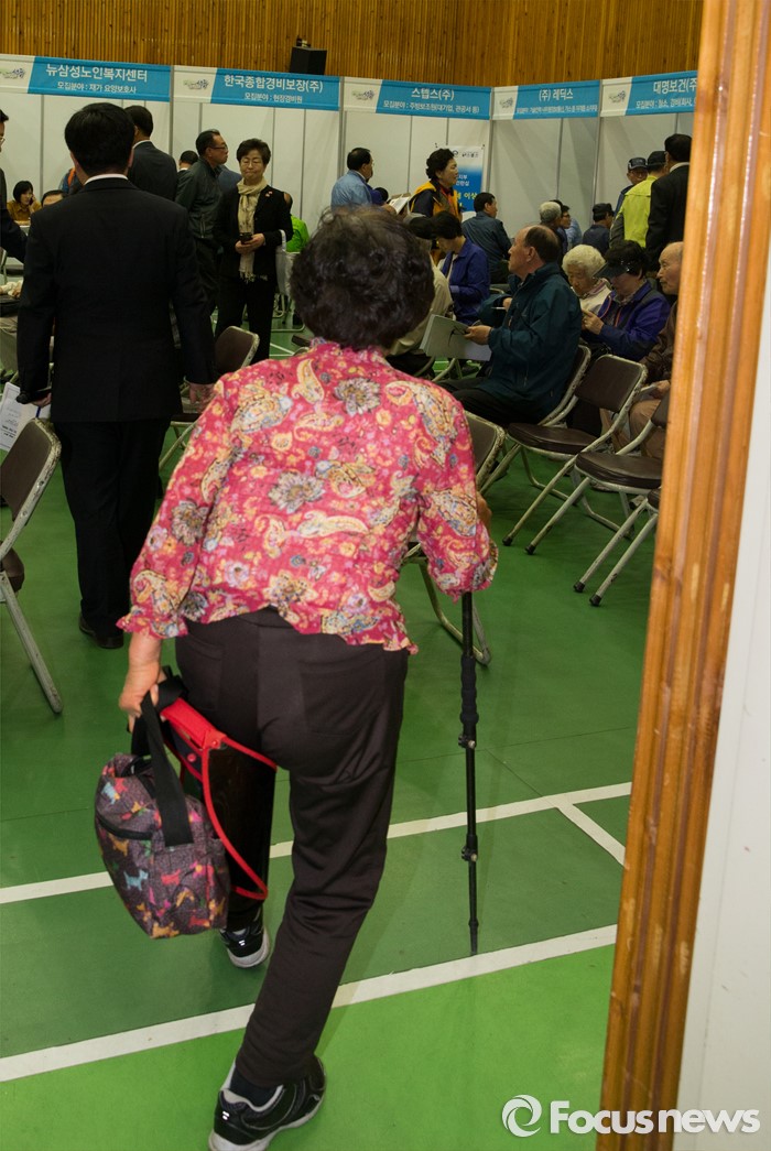 (대전=포커스뉴스) 28일 오후 대전 서구 노인복지관 3층 대강당에서 열린 찾아가는 시니어 취업 박람회를 찾은 구직희망자가 구직상담부스로 이동하고 있다.