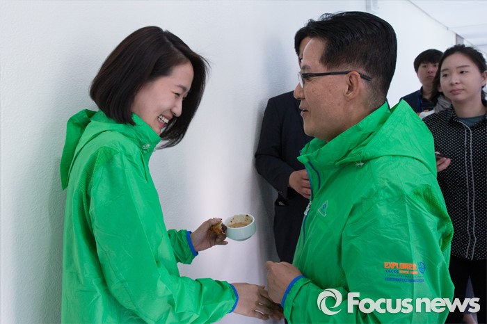 (양평=포커스뉴스) 박지원(오른쪽) 국민의당 의원과 김수민 비례대표 당선인이 26일 오후 경기도 양평 한화리조트에서 열린 국민의당 20대 총선 당선자 워크숍에 참석해 인사하고 있다.