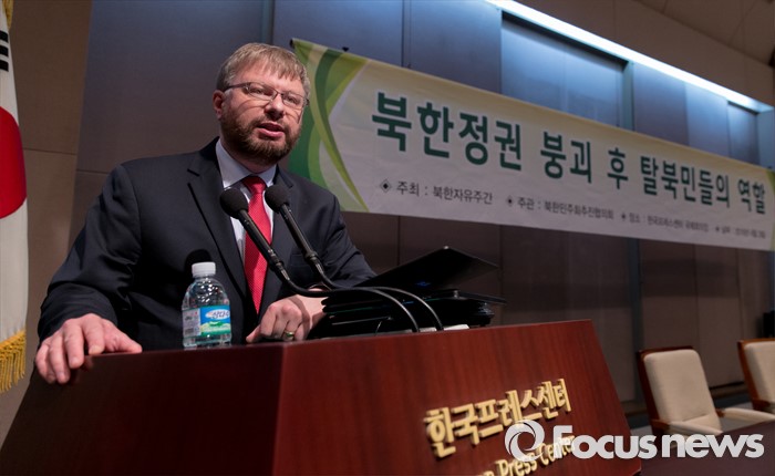 (서울=포커스뉴스) 28일 오후 서울 중구 프레스센터에서 북한정권 붕괴 후 탈북민들의 역할 대토론회에 참석한 그렉 스칼라튜 미국 북한인권위원회 사무총장이 인사말과 기념사를 하고 있다.