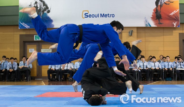 (서울=포커스뉴스) 28일 오후 서울 성동구 서울메트로 인재개발원에서 열린 지하철보안관 무술 경연 대회에서 서울메트로 소속 지하철보안관들이 낙법 시범을 선보이고 있다.