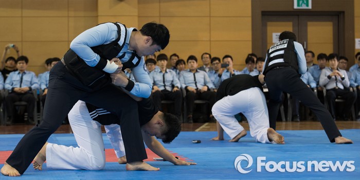 (서울=포커스뉴스) 28일 오후 서울 성동구 서울메트로 인재개발원에서 열린 지하철보안관 무술 경연 대회에서 서울메트로 소속 지하철보안관들이 무술 시범을 선보이고 있다.