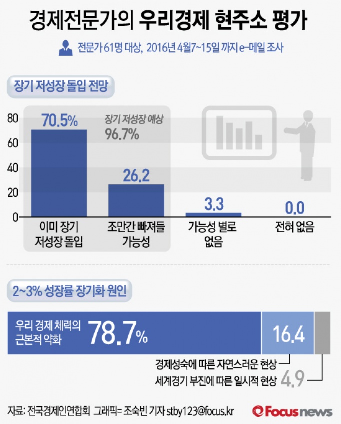 (서울=포커스뉴스) 25일 전국경제인연합회가 경제전문가 61명을 대상으로 '우리경제 현주소 평가 및 대책'을 조사한 결과에 따르면, 10명 중 7명은 이미 장기 저성장에 돌입했다고 답했다.