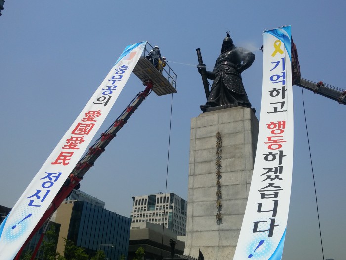 애국애민 정신을 바탕으로 참사를 잊지 말자는 의미에서 준비했다"며 "백성 함께 목숨을 걸고 싸워 백척간두의 위기에서 나라를 구한 이순신 장군의 정신을 다시 한 번 되새겨 세월호 참사와 같은 비극이 다시는 일어나지 않기를 바란다"고 밝혔다.서울시·여수시·아산시가 25일 오후 서울 광화문 광장에서 이순신 동상 친수식 행사를 열고 충무공의 정신을 기리는 시간을 가졌다. 장지훈 기자 jangpro@focus.co.kr