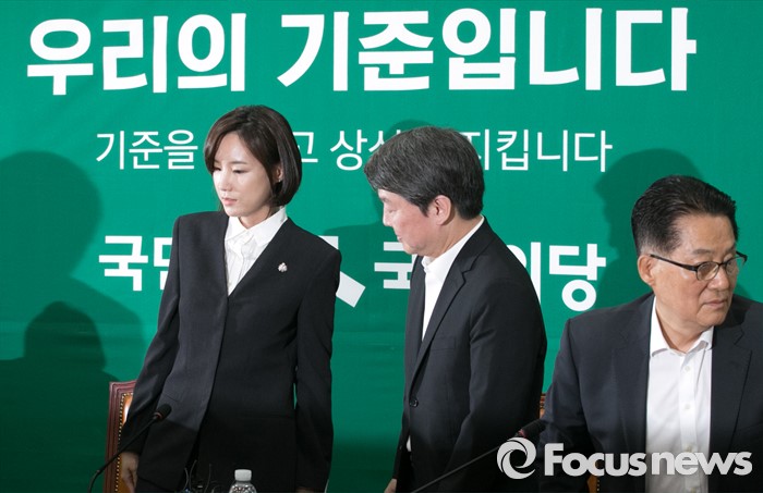 (서울=포커스뉴스) 2일 오전 서울 여의도 국회에서 열린 국민의당 최고위원회의에 故 가수 신해철의 아내 윤원희(왼쪽부터) 씨, 안철수 상임공동대표, 박지원 원내대표가 참석하고 있다.