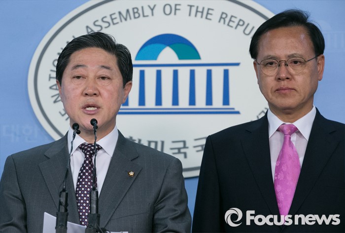 (서울=포커스뉴스) 유기준(왼쪽) 새누리당 의원이 28일 오후 서울 여의도 국회 정론관에서 정책위의장 러닝메이트 후보인 이명수 의원과 원내대표 출마 기자회견을 하고 있다.