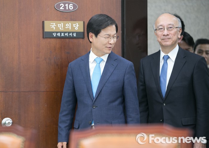 (서울=포커스뉴스) 천정배(왼쪽) 국민의당 공동대표가 29일 오후 서울 여의도 국회를 방문한 벳쇼 코로 주한일본대사와 함께 간담회장으로 들어서고 있다.