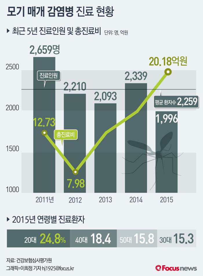 (서울=포커스뉴스) 1일 건강보험심사평가원 분석한 결과에 따르면 말라리아·뎅기열 등 모기 매개 감염병 환자가 연평균 2,259명에 이르는 것으로 나타났다. 진료인원 연령대로는 활발한 야외활동을 많이 하는 20대가 가장 많았다.
