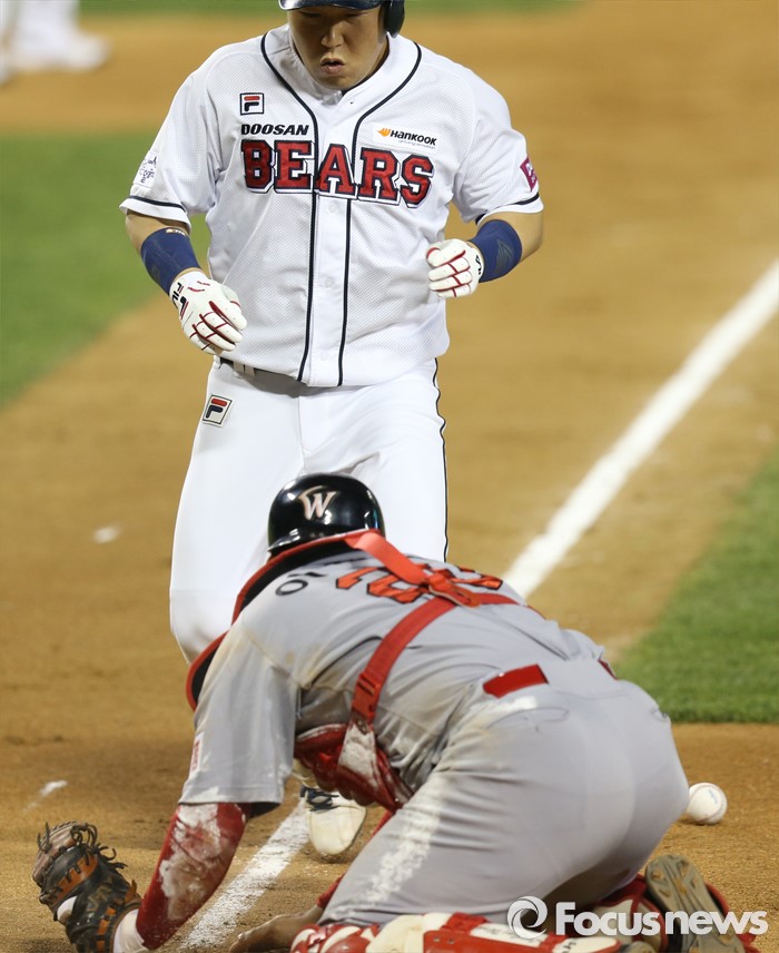 (서울=포커스뉴스) 26일 서울 잠실구장에서 열린 2016 프로야구 SK-두산 경기 6회말 1사 2,3루에서 두산 최주환의 1루땅볼때 3루주자 양의지가 SK 1루수 최승준의 송구 실책으로 홈에서 세이프되고 있다.