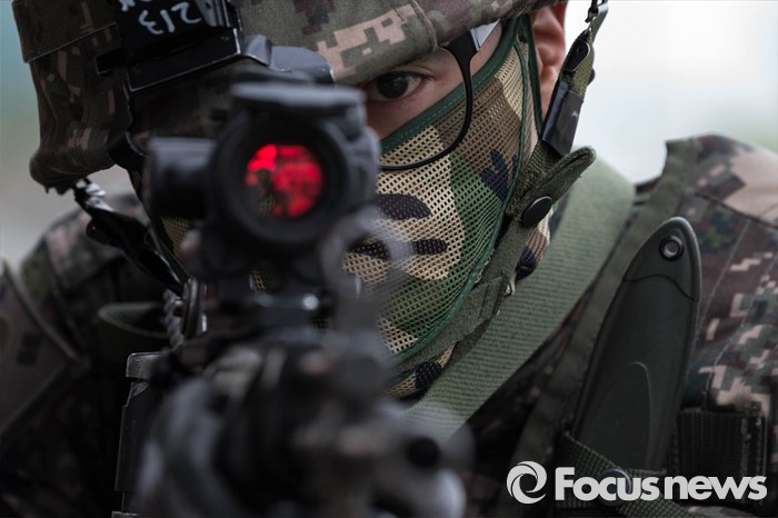 (서울=포커스뉴스) 27일 오전 서울 영등포구 여의도 한강공원 원효대교 일대에서 열린 '수도 서울 민․관․군 합동 대규모 복합재난 가상훈련'에 참가한 군인들이 경계를 서고 있다.