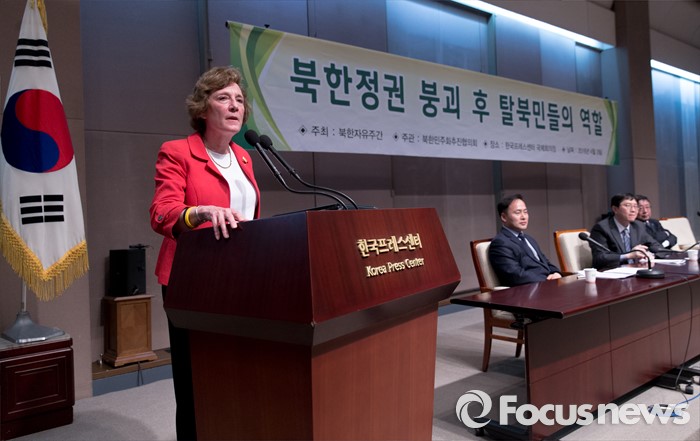 (서울=포커스뉴스) 28일 오후 서울 중구 프레스센터에서 북한정권 붕괴 후 탈북민들의 역할 대토론회에 참석한 수잔 숄티 디펜스포럼 대표가 주제발표를 하고 있다.