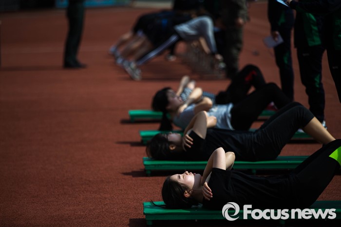 (서울=포커스뉴스) 28일 오후 서울 효창동 효창운동장에서 열린 학군단 57기 후보생 선발전형 체력검정에서 숙명여대 응시생들이 시험을치르고 있다.