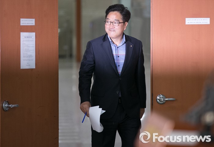 (서울=포커스뉴스) 우원식 더불어민주당 의원이 29일 오후 서울 여의도 국회 정론관에서 원내대표 출마 기자회견을 위해 입장하고 있다.