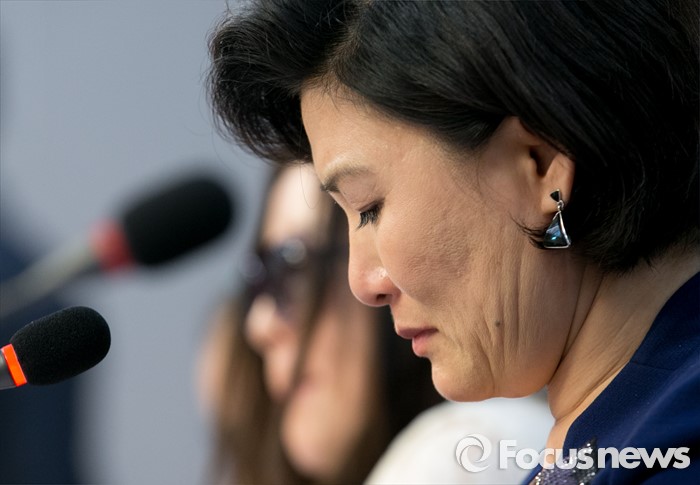 (서울=포커스뉴스) 26일 오후 서울 여의도 국회 의원회관에서 북한자유주간 주최, 통일맘연합 주관으로 열린 중국과 제3국에서 자녀와 헤어진 탈북여성들의 호소, '내 아이를 안고 싶어요' 증언대회에 참석한 북한 여군 장교 출신 탈북 방송인 김정아 씨가 발언 중 눈물을 흘리고 있다.
