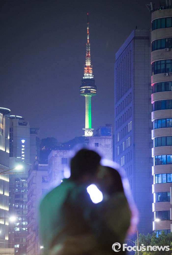 (서울=포커스뉴스) 브라질 리우데자네이루 올림픽 개막 100일을 앞둔 27일 밤 N서울타워에 브라질을 상징하는 노란색과 초록색 조명이 불을 밝히고 있는 가운데 서울광장에서 연인들이 사랑을 나누고 있다.