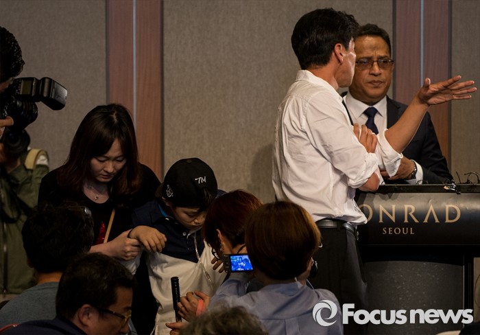 (서울=포커스뉴스) 2일 오전 서울 영등포구 콘래드호텔에서 열린 '옥시레킷벤키저(현 RB코리아) 가습기 살균제 파동' 관련 기자회견에서 아타 울라시드 사프달 옥시코리아 대표가 피해자 가족들에게 항의 받고 있다.