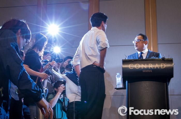 (서울=포커스뉴스) 2일 오전 서울 영등포구 콘래드호텔에서 열린 '옥시레킷벤키저(현 RB코리아) 가습기 살균제 파동' 관련 기자회견에서 아타 울라시드 사프달 옥시코리아 대표가 피해자 가족들에게 항의 받고 있다.