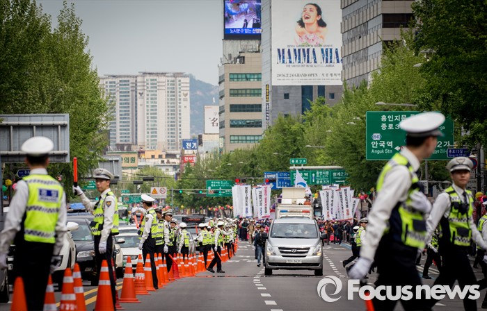 (서울=포커스뉴스) 근로자의날을 맞은 1일 오후 서울광장에서 열린 한국노총 5.1 전국노동자대회를 마친 참가자들이 종로로 행진을 이어가고 있다.