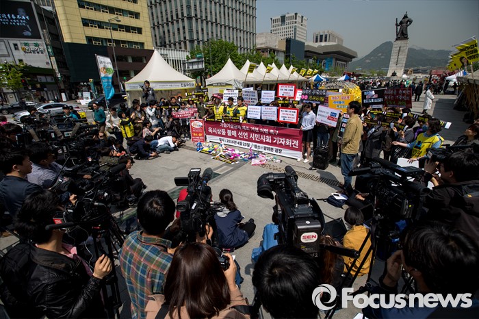 (서울=포커스뉴스) 25일 오전 서울 종로구 광화문 광장에서 옥시 가습기 살균제 피해 가족 및 환경단체 관계자들이 옥시 상품 불매를 촉구하는 기자회견을 하고 있다.