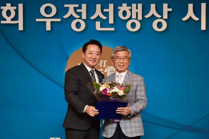 이웅열 오운문화재단 이사장은 이날 시상식에서 수상자들에게 고마움과 경의를 표하며 "앞으로도 우정선행상은 선행의 은혜로움과 소중함에 보다 많은 사람들의 공감을 이끌어 더욱 살 맛 나는 세상 만들기에 노력하겠다"고 말했다.이웅열 오운문화재단 이사장(코오롱그룹 회장, 왼쪽)과 대상 수상자 이긍호 씨가 기념촬영을 하고 있다.<사진제공=코오롱>