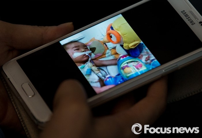 (서울=포커스뉴스) 2일 오전 서울 영등포구 콘래드호텔에서 열린 '옥시레킷벤키저(현 RB코리아) 가습기 살균제 파동' 관련 기자회견장 앞에서 피해자 가족인 곽윤희 씨가 9년전 가습기 살균기 피해로 세상을 떠난 아들 장준원 군의 생전 영상을 취재진에게 공개하고 있다.