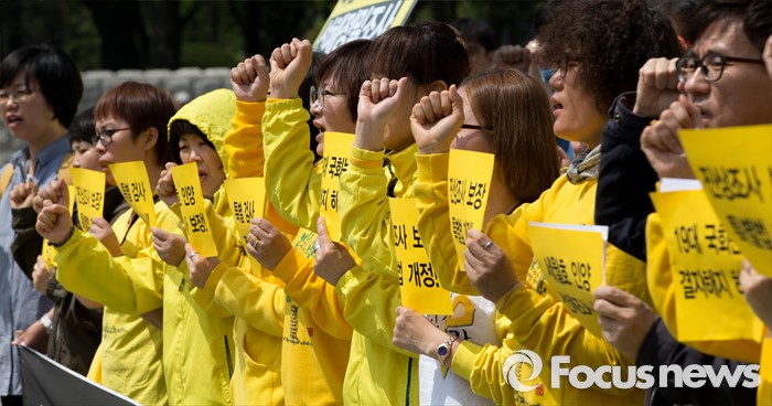 (서울=포커스뉴스) 25일 오전 서울 여의도 국회의사당 정문 앞에서 4월 16일의 약속국민연대 관계자들이 세월호 진상규명 특별법 개정 및 특검 실시 촉구 기자회견을 하고 있다.