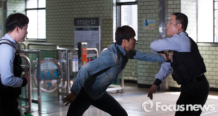 (서울=포커스뉴스) 28일 오후 서울 성동구 성수역 대합실에서 난동자가 서울메트로 소속 지하철보안관들을 위협하는 훈련을 하고 있다.