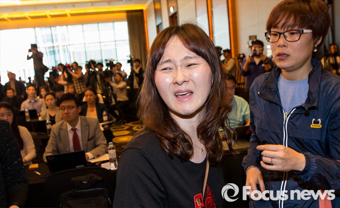 (서울=포커스뉴스) 2일 오전 서울 영등포구 콘래드호텔에서 열린 '옥시레킷벤키저(현 RB코리아) 가습기 살균제 파동' 관련 기자회견에서 피해자 가족들이 오열하고 있다.