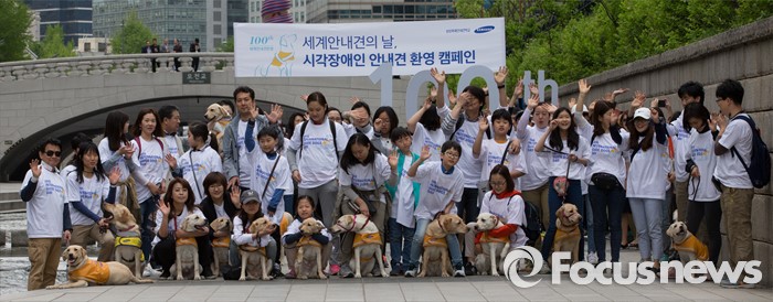 (서울=포커스뉴스) 27일 오전 서울 청계천에서 삼성화재안내견학교 훈련사들과 안내견들이 시민들과 함께 '안내견과의 만남' 행사를 하고 있다.