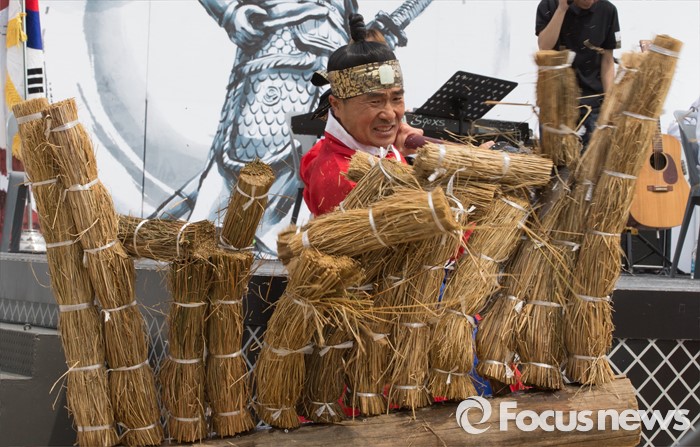 (서울=포커스뉴스) 28일 오전 서울 중구 남산골한옥마을에서 열린 '충무공 탄생 471주년 기념 다례식'에서 무예공연이 펼쳐지고 있다.