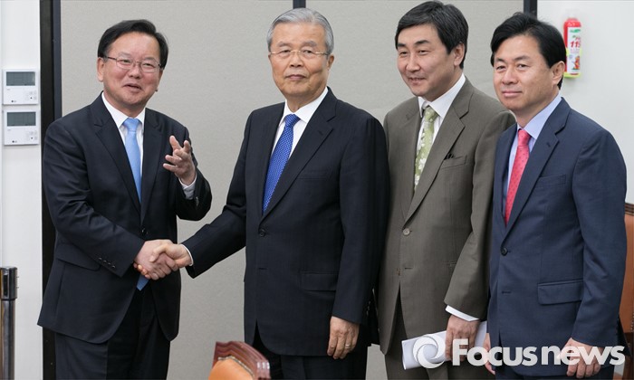 대구 수성갑에서 당선된 김부겸 당선인은 김 대표가 더민주에 합류해 원내 1당이라는 역사에 기록될 만한 사건을 이뤄냈다고 평가하며 감사의 말을 전한 것으로 알려졌다.김종인 더불어민주당 비대위 대표가 18일 오전 서울 여의도 국회에서 비상대책위원회의에 앞서 당선 인사를 위해 방문한 김부겸 대구 수성갑 당선인과 악수하며 포즈를 취하고 있다. 오른쪽부터 김영춘 비대위원, 이종걸 원내대표, 김 대표, 김 당선인. 2016.04.18 박동욱 기자